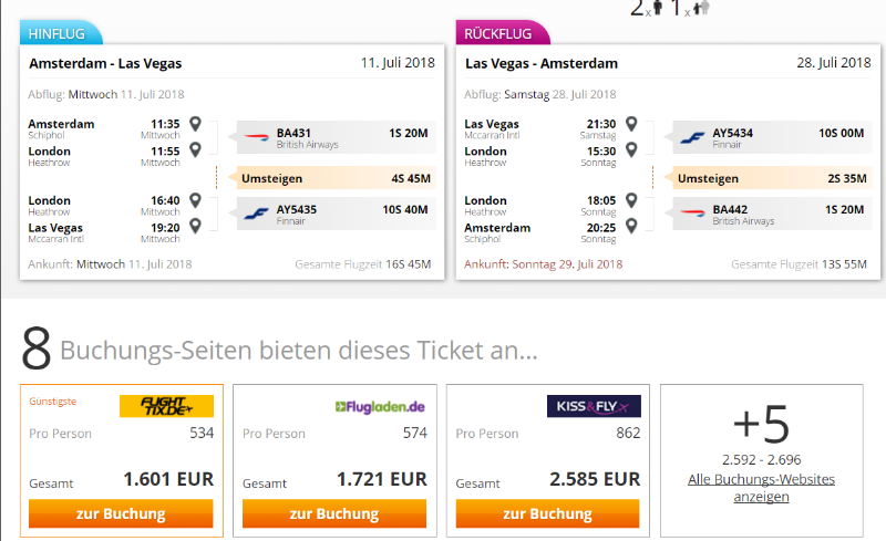 Ik wil met drie personen ergens vanaf 11 juli vertrekken naar Las Vegas en daar 17 dagen blijven. Nu ben ik de tickets aan het bekijken en er is geen rechtstreekse vlucht vanaf