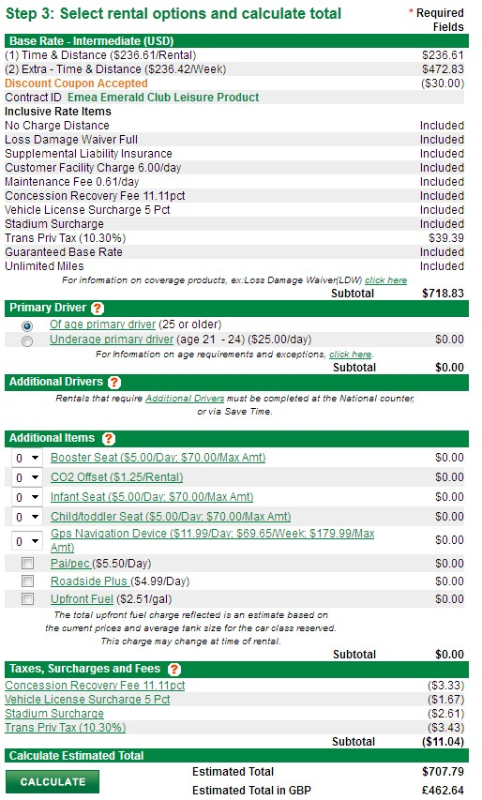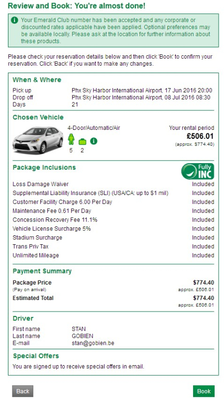 Het goedkoopste tarief dat ik vind is 707$ (+/- 636€) voor de midsize car, met gebruik van de Emerald Leisure contract ID en de coupon code voor 30$.