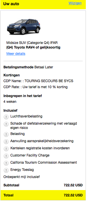 Ik heb ingelogd op Hertz.com, ingevuld dat ik in België woon, taal op Nederlands gezet en gekozen voor de kortingscode van Touring (504060) bij Club Code.