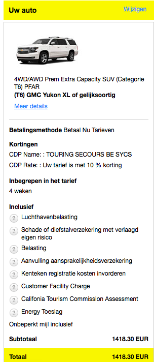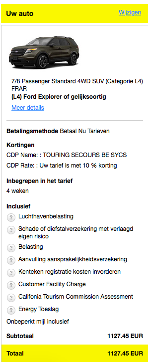 Ik had een boeking voor vier weken bij Budget (via AutoEurope) voor 1614 euro voor de Premium SUV, dus de Expedition XL voor 1614 euro. Bij Hertz heb ik nu de Premium SUV via de korting van de RACE (Spaanse ANWB) voor 1176 euro.