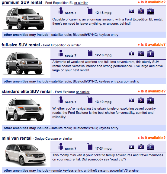 Zou wel handig zijn, want als je via autoeurope boekt, kom je wel de auto tegen (bv Ford Escape) maar weet je niet of dit over een midsize, standaard of fullsize SUV gaat.
