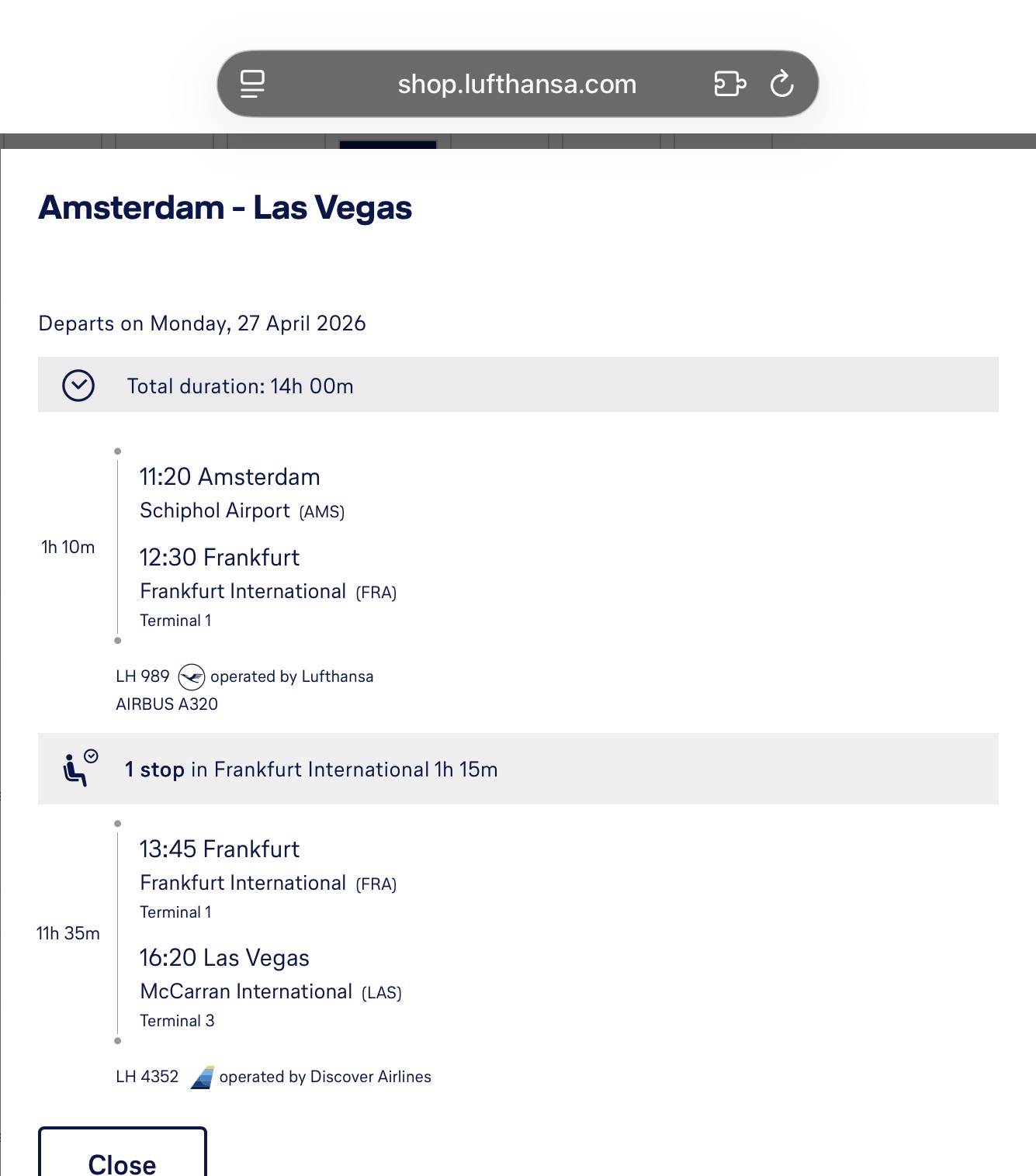 Ander voorbeeld hieronder van een vlucht die ik dus niet zo snel zou boeken. Vlucht naar Las Vegas in de meivakantie via Frankfurt met Lufthansa en Discover met 1:15u overstap. Dan hoeft er maar iets te gebeuren, iets te laat weg uit Amsterdam bijvoorbeeld, of toevallig druk bij de paspoortcontrole op Frankfurt en het wordt penibel.