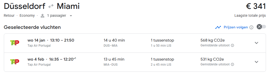 DUS-MIA 1 overstap vanaf 319,- maar een lange overstap. Beter: 341,- 14jan-4feb met gunstige tijden, zie screenshot