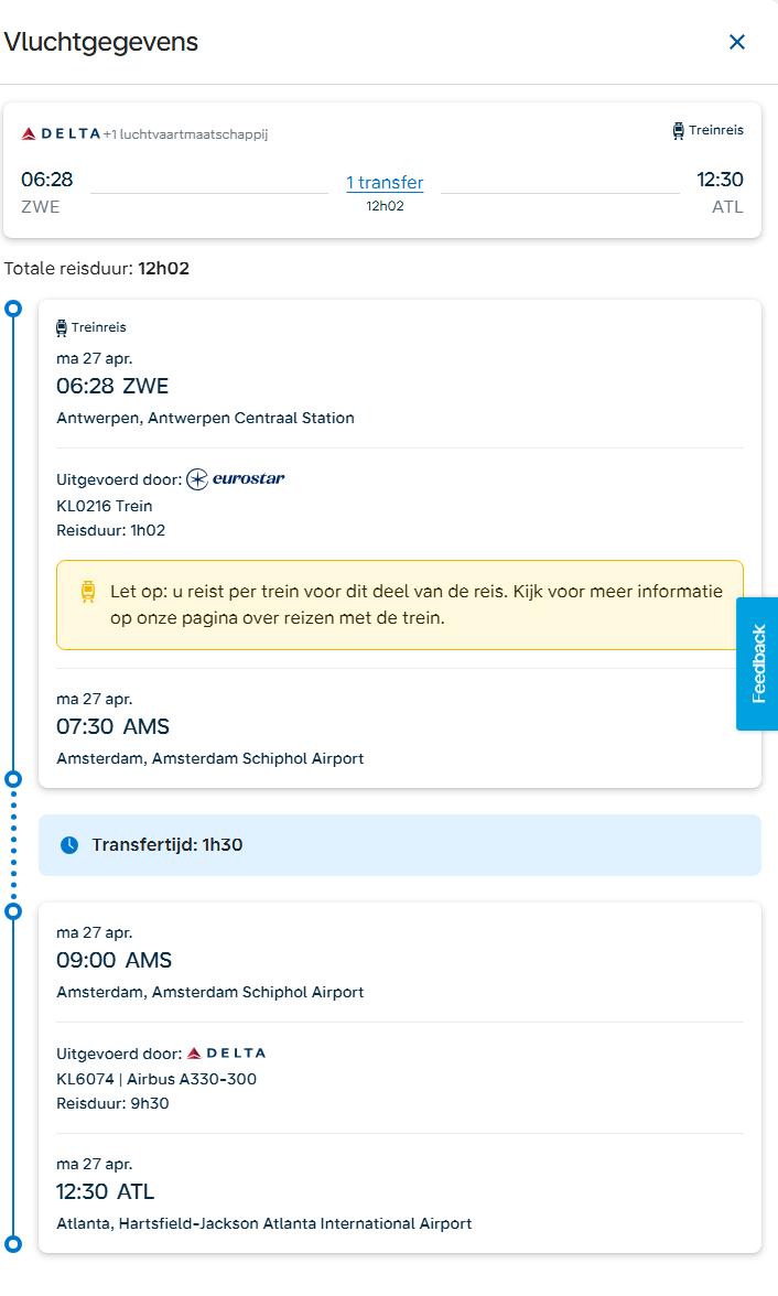 Vergeet ook niet de route vanaf Antwerpen (ZWE) of Brussel-midi (ZYR). Te boeken via klm en vaak een stuk goedkoper dan vanaf Amsterdam. Je reist dan met de Eurostar naar Schiphol. Bij vertrek vanaf Antwerpen krijg je je boardingpas online en kan je de treinreis ongestraft overslaan. Vanaf Brussel-midi moet je je ticket ter plekke afhalen en moet je dus wel echt de treinreis nemen.