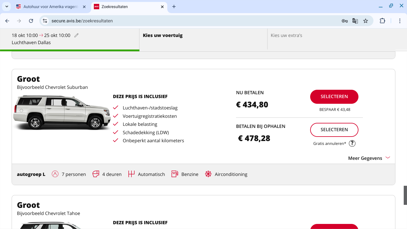 Hallo allemaal, ik ben zoek naar een enigszins betaalbare Premium SUV vanaf Dulles voor de periode 18-25 oktober. We reizen met vier volwassenen en best wat bagage en zou graag hierom een Jeep Wagoneer willen huren. Tot nu toe kom ik alleen bij AVIS.be tot een redelijke prijs (€420) maar AVIS Dulles staat erg slecht aangeschreven. Als alternatief heb ik bij Sixt een Extraordinary (XFAR) BMW X5 voor $573 gehuurd. Bij National kom voor een Premium SUV uit op $1258 incl verzekeringen (en 1 kortingsdag). Zijn deze grote prijsverschillen normaal of kijk ik verkeerd? En heeft er iemand ervaringen met AVIS op Dulles? Alvast bedankt!