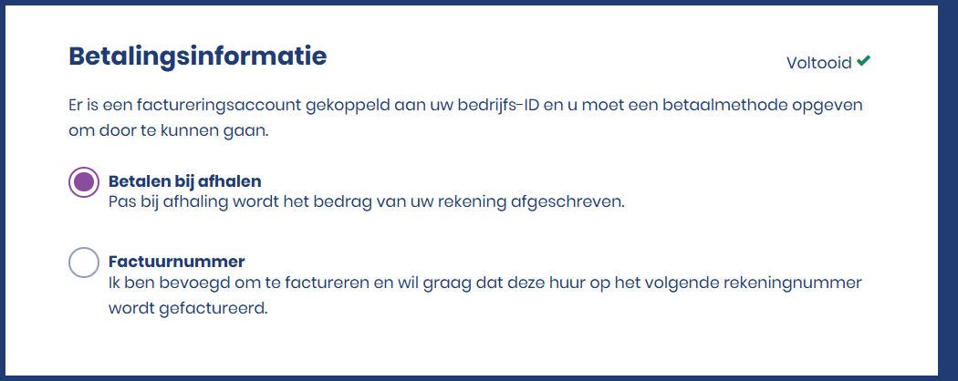 Optie 2 is vooraf betalen. Zodra je deze optie selecteert zal je op een vervolgscherm je betalingsgegevens (banknr of CC gegevens) moeten opgeven. De opmerking die je ziet geeft enkel aan dat je bevoegd bent om te betalen en dat je op de vervolgschermen je betaalgegevens zal invoeren. Dit is de af te raden optie; je verliest hiermee veel flexibiliteit.