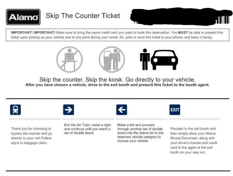 Je hoeft niets te laten zien aan de greeter. Je kunt gewoon direct doorlopen en een auto uitzoeken. Vaak genoeg zie je helemaal niemand tot aan de exit booth. Overigens misschien om verwarring te voorkomen: een eventuele voucher die je bij een prepaid boeking krijgt is niet wat @AlmereVakV hier bedoeld. Wat je nodig hebt is het "Skip-the-counter ticket" dat je print nadat je op alamo.com het online check-in en skip-the-counter proces hebt voltooid (twee aparte stappen!). Daar staat bovenaan ook echt "Skip the counter ticket" met een barcode, zoals deze:Almere vak V schreef:Laat je je voucher zien aan de greeter. Die wijst je uit welke rij je een auto mag uitzoeken.
