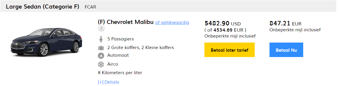 Als ik zoek op 16 dagen in augustus dan kom ik op prijzen uit van 810$ voor een midsize suv en 923$ voor een standard suv