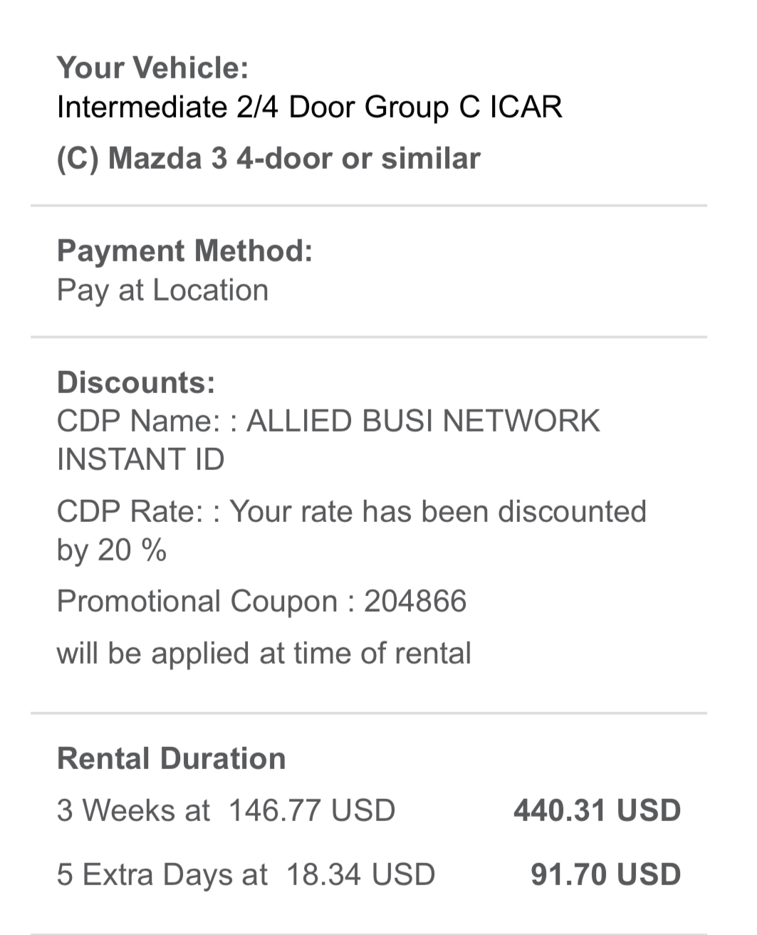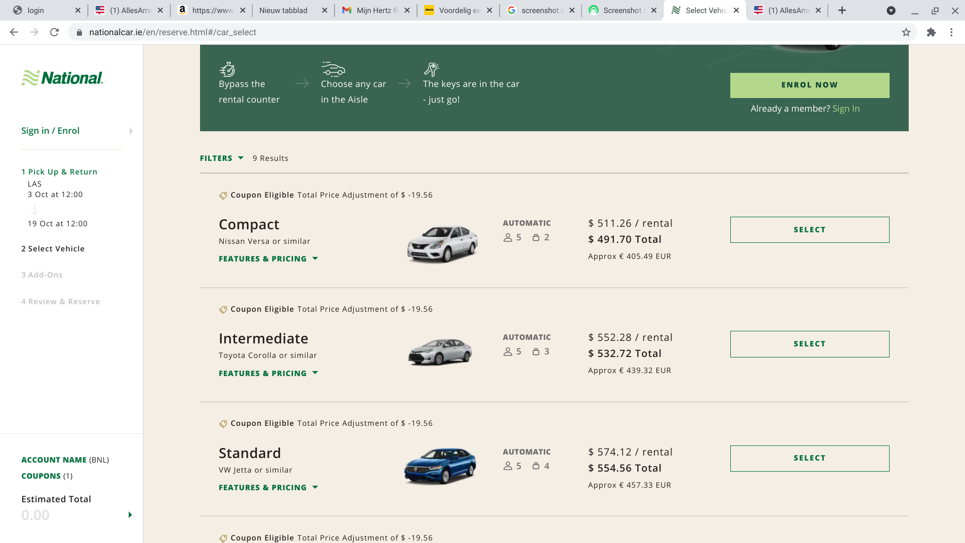 Nu gevonden: Hertz (FR, President's Circle via status match national): 969 USD voor small pick up (vrije keuze uit de aisles)