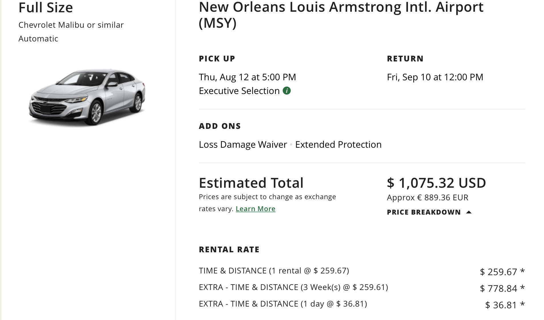 Een gewone midsize auto waarmee je kunt kiezen uit de emerald aisle kost 661$ voor dezelfde periode. Dan kan je je SUV boeking als back up houden mocht er niets interessants in de aisle staan.