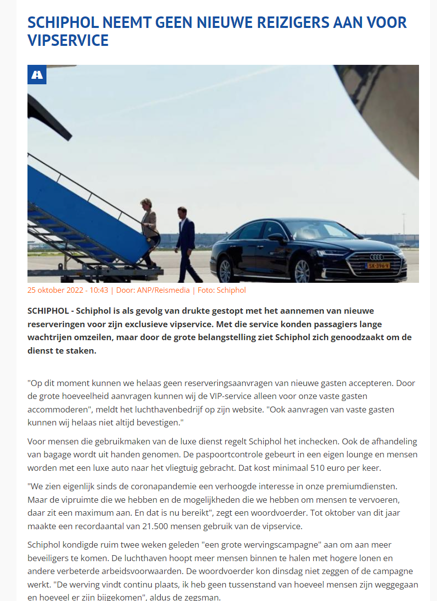Da's nou jammer, Schiphol stopt met de minimaal EUR510 kostende VIP service. Niet dat ik er gebruik van zou maken ;) https://www.luchtvaartnieuws.nl/nieuws/ ... vipservice