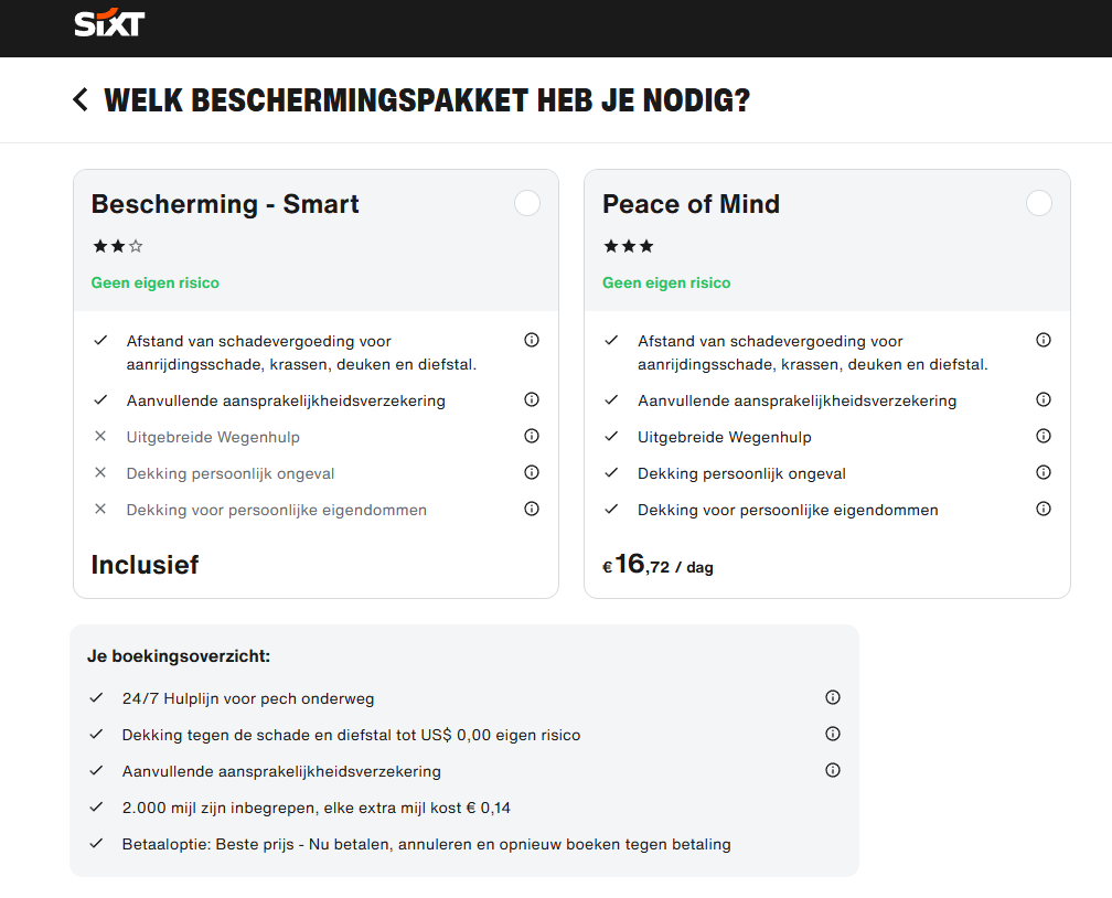 Bij Sixt kan je ook Peace of Mind aanvinken, hier zit LDW bij en persoonlijke verzekeringen (die ik al heb via mijn reisverzekering).