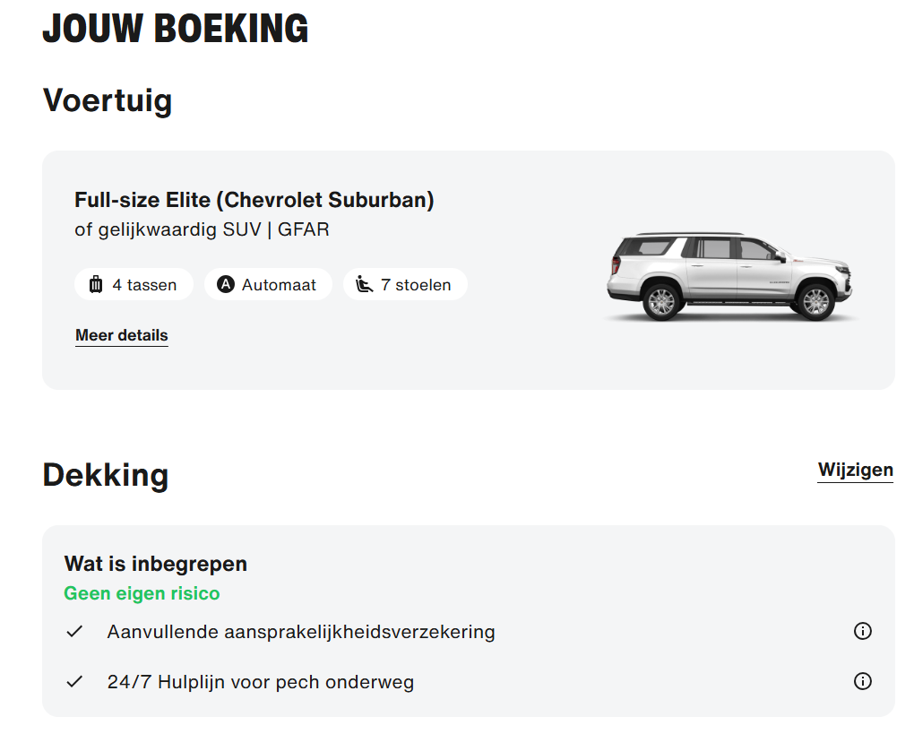 Nu ben ik voor volgend jaar aan het kijken om weer bij San Francisco te gaan huren en kom op dit moment via autoeurope uit bij sixt: Chevrolet Suburban (GFAR) voor ongeveer 1100 euro. Leek mij een goede deal voor 20 dagen. Deze heb ik geboekt met gratis annuleren maar weet niet zeker of de verzekeringen en dergelijke voldoende zijn. Pas na het boeken rechtstreeks via sixt kon ik het volgende zien op de bevestiging: