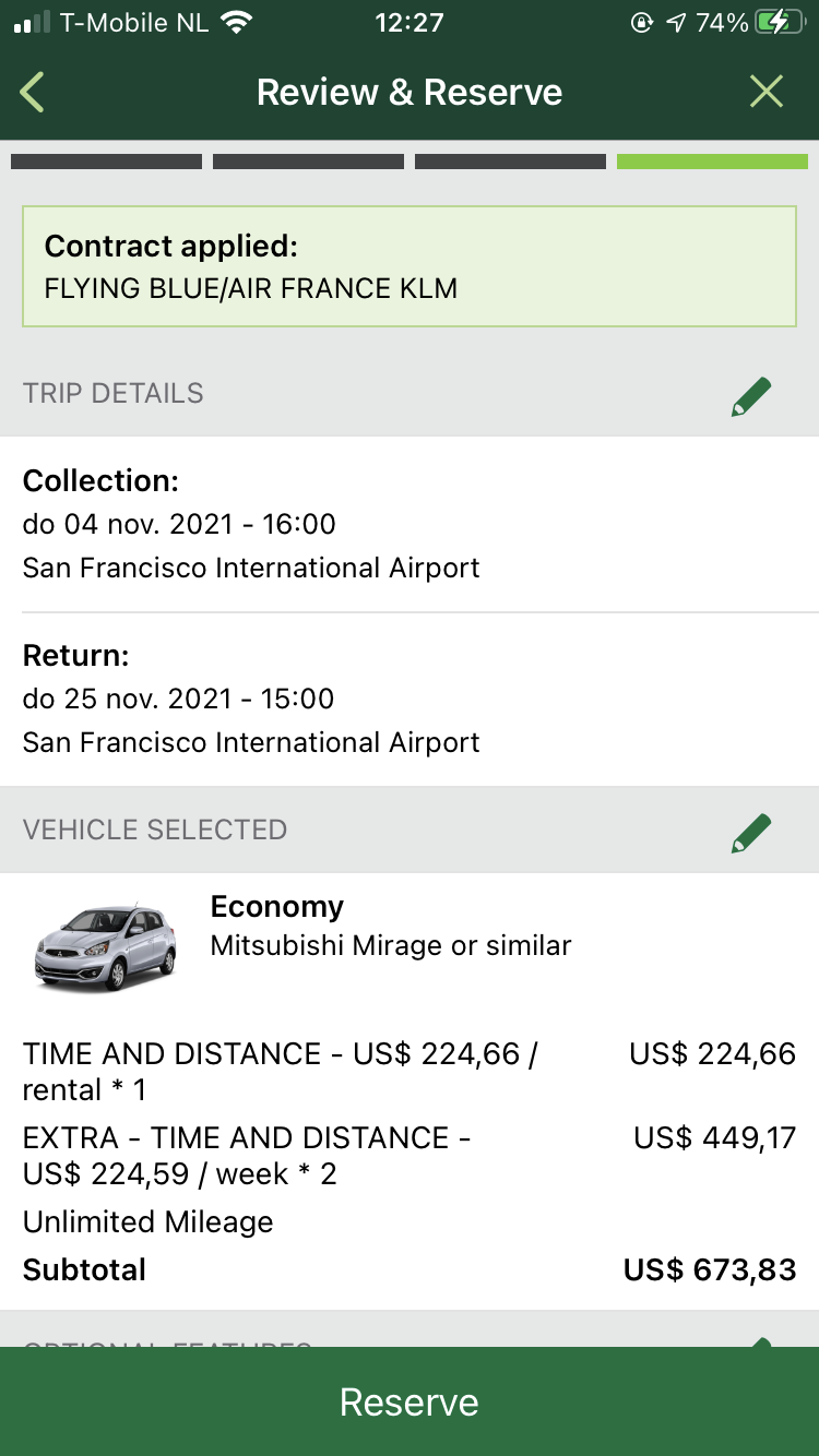 Ik heb 741,57 dollar voor een intermediate (met executive area) staan dus dat scheelt niet zo heel veel. Reservering gedaan in de app. Ik ga nog eens kijken. Ik heb een back up boeking voor een SUV bij Hertz (1157 dollar)