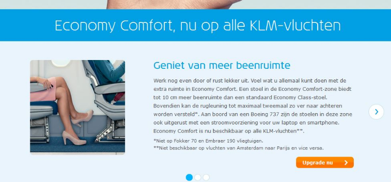 Ik heb niet alles gecheckt, maar volgens mij klopt er het een en ander in dat overzicht niet. Bovendien is het verre van volledig. Ik heb zelf ervaring met Economy Plus (United) en Economy Comfort (Delta en KLM). Ik vermoedde al dat de gegevens voor KLM niet klopten, dus ben ik even naar de site van KLM gegaan. Economy Comfort is zeker geen 97 cm, laat staan 140 cm.