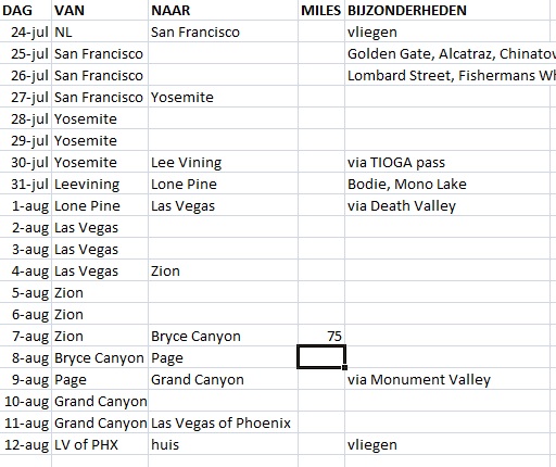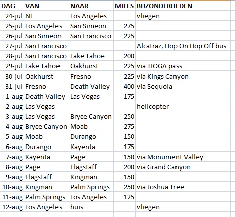 Ik zou zeggen: kijk eens goed wat je overal wilt doen, neem tijd om eens wat te ondernemen in de parken en steden, lees eens wat reisverslagen en bekijk de voorbeeldroute eens.