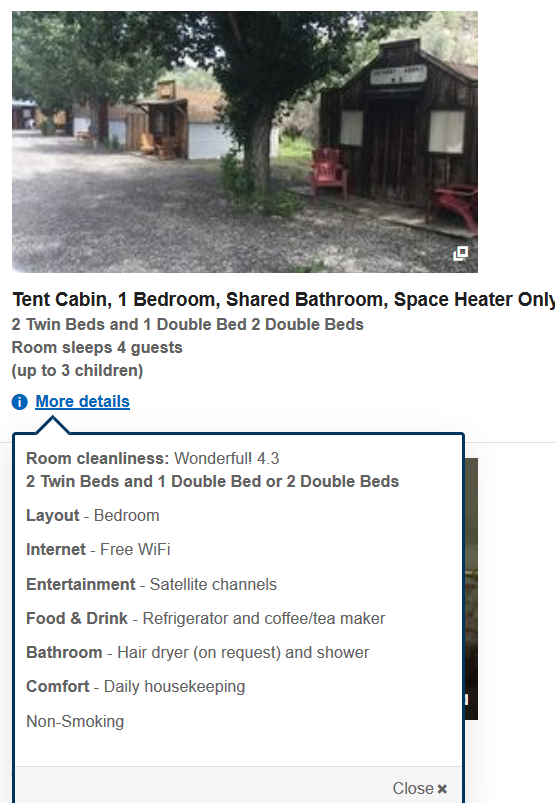 Of het werkelijk waar is weten weten we pas op 4 oktober maar mij leek een tentcabin bij de Virginia Creek Settlement (aan Hwy395, 1 mijl t.n.v. de afslag naar Bodie) wel leuk (en ook niet duur).