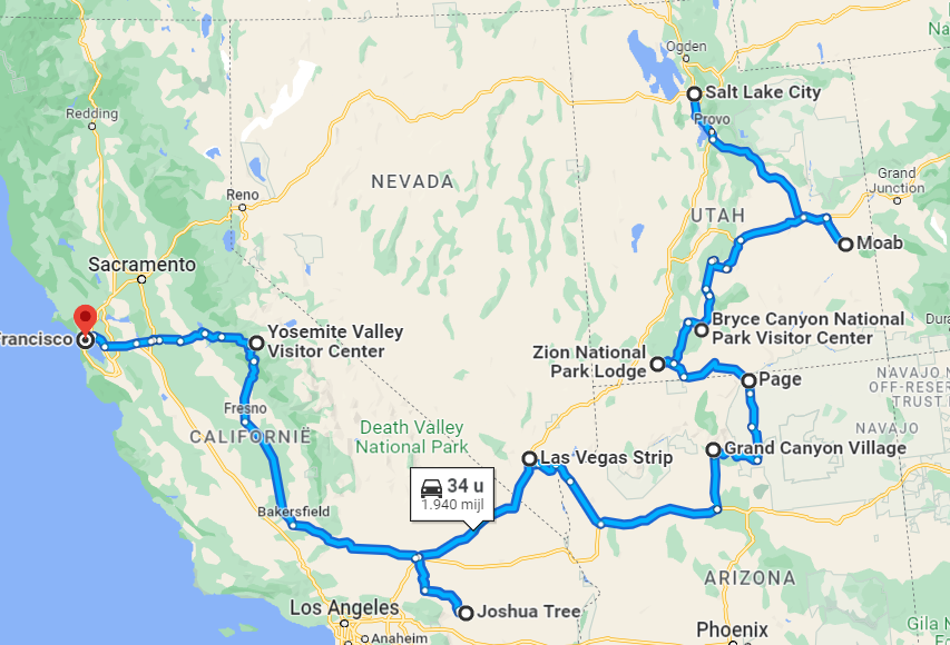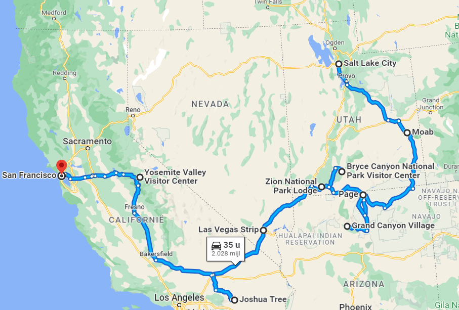 Ik heb een route uitgeschreven zodat je kunt zien of het past in 3,5 week. Onderstaand is in het begin volgens de route van Paul, maar ik heb Joshua Tree weggelaten en in plaats daarvan de route via de TIoga PAss genomen. Er is wel een risico begin juni dat hij niet open is, maar dan is het nog mogelijk om een noordelijke route te nemen.