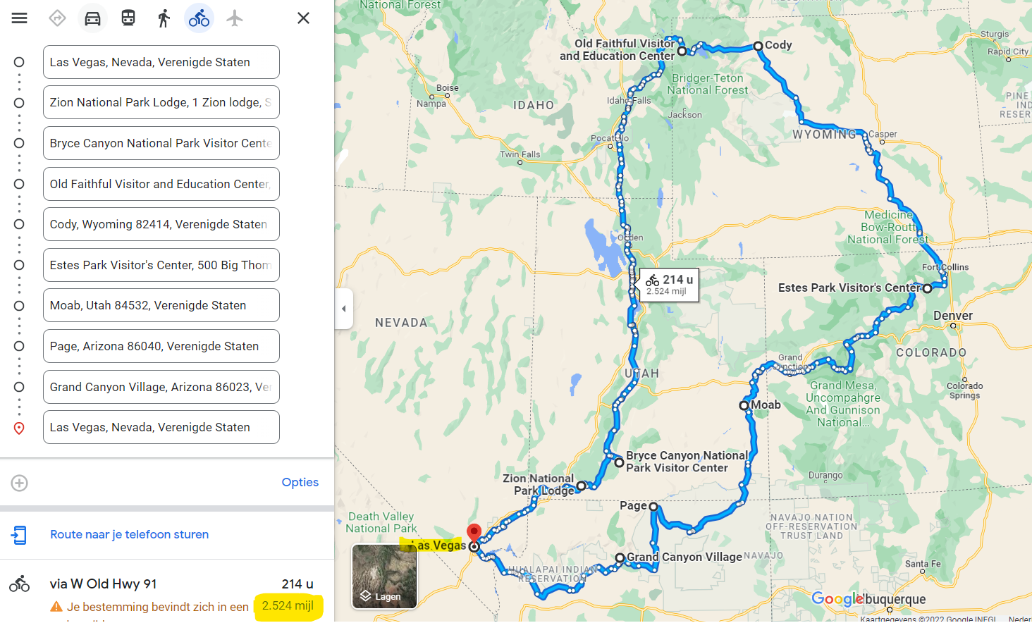 (Let niet op de tijd: heb 'm ff als fietsroute erin gezet ivm winter (afgesloten wegen Yelowstone...)