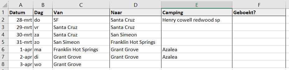 Ik weet niet hoe je nu alles hebt genoteerd, maar zet de route eens in excel, en doe dan een kolom met "Van" en eentje met "Naar". En verwijs dan in de cel waarin "Van" staat naar de regel erboven waarin "Naar" staat; dan gaat het altijd goed. En dan een kolom met de camping en een met de reserveringsgegevens.