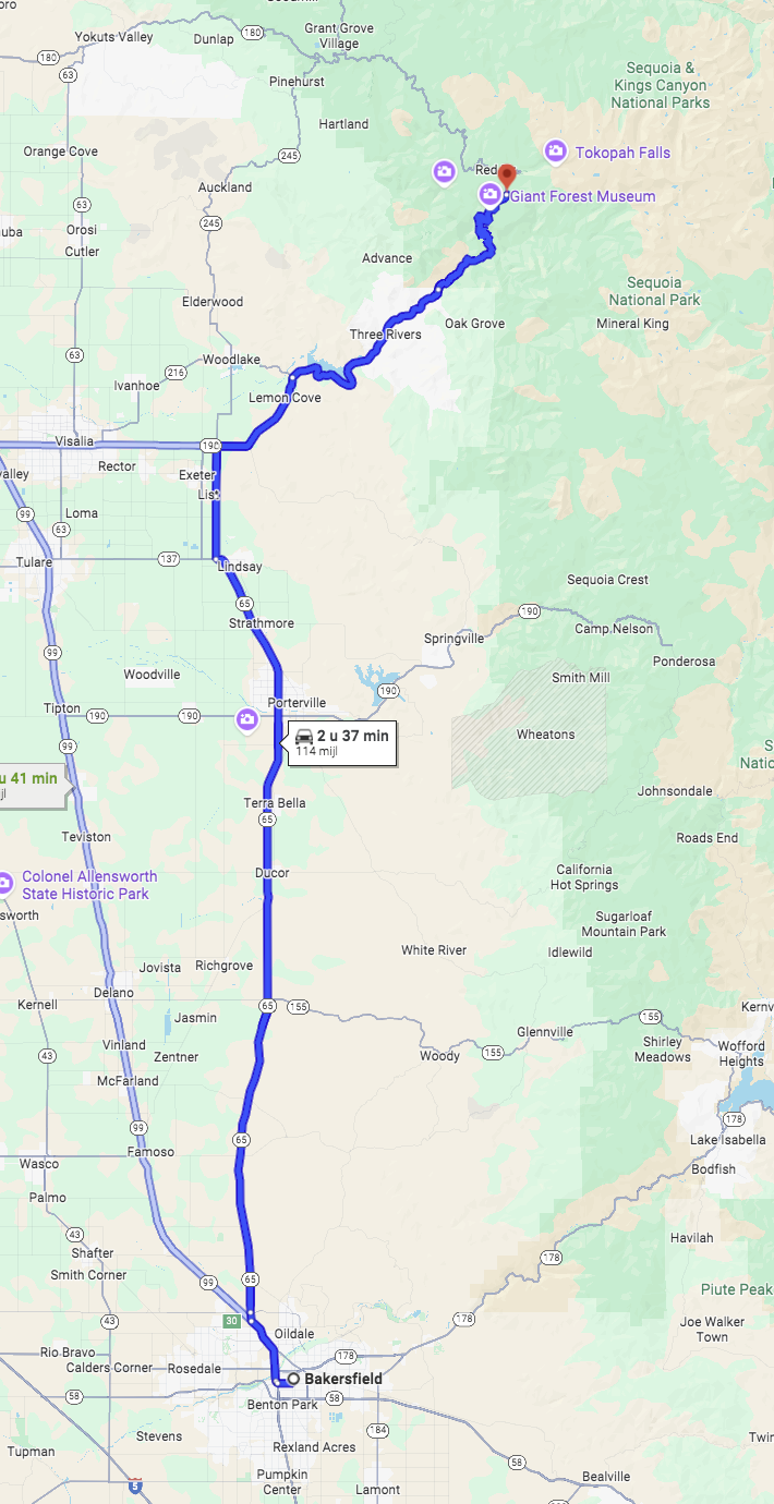 Ik weet niet wat je wilt zeggen met de afstand van Bakersfield naar de General Sherman. Ja, dat is (ruim) 2,5 uur, bijna 3 uur rijden. Maar je wilt daarna naar LA, dus dan kom je echt op die 7 uur die ik noemde. En nog wel meer; je moet ergens parkeren en dan een stuk lopen voor je bij de General Sherman bent, dus het is meer dan drie uur voordat je er bent.
