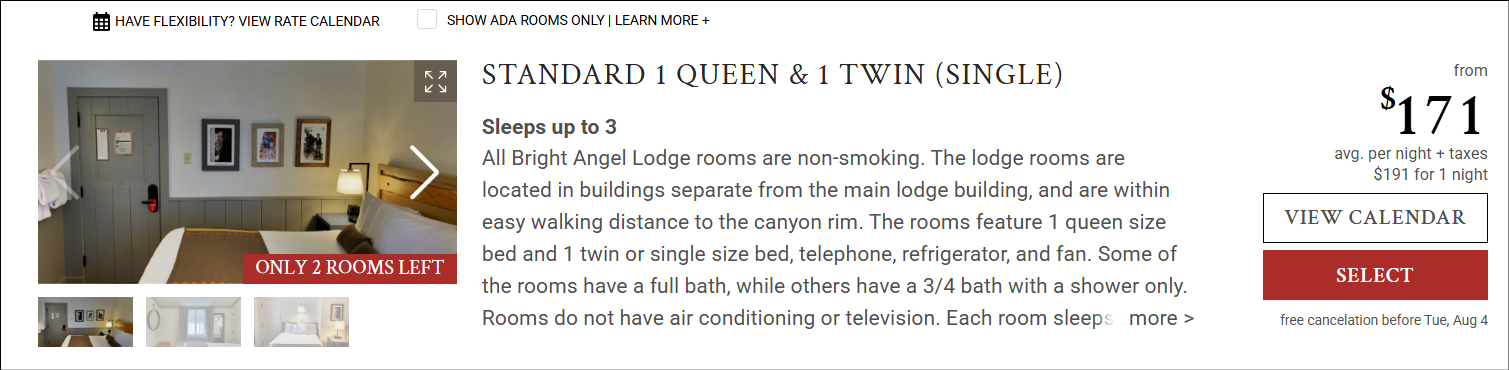 Nee, ik bedoel zeker niet op de bonnefooi gaan, dat zou ik in het hoogseizoen nooit doen. Nee, gewoon van te voren boeken. En ja, dat kan via booking.com, maar voor de parken zou je kunnen kijken naar iets in het park. Voor Yosemite kun je reserveren via www.travelyosemite.com. Voor de Grand Canyon zie www.grandcanyonlodges.com. Vooral de Bright Angel Lodge is betaalbaar en erg goed gelegen. Je kunt meestal een jaar van te voren al boeken, dus kijk daar eens naar. Annuleren is vaak tot 24 uur van te voren gratis. Als de data vast staan kun je dus nu al gaan kijken. Je zult zien dat de betaalbare opties snel weg zijn. Voor de GC heb je nu nog wel ene mogelijkheid in de bright Angel Lodge: