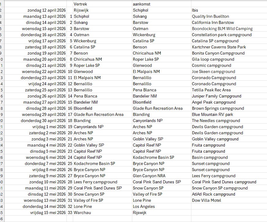 Wij gaan in april volgend jaar ook weer het zuidwesten doen en hebben weliswaar meer dagen dan jullie, maar misschien hebben jullie toch wat aan ons plan. Er zitten een paar langere reisdagen in, maar voor ons doen best weinig. We komen in totaal in 32 dagen op ruim 5600 km. We vliegen op Los Angeles en halen de camper op in Las Vegas. Als je die eerste dagen ervan af haalt, dan scheelt het alweer. En ook van Las Vegas naar LA kun je dan schrappen. We vliegen op LA omdat we met LOT vliegen en die doet Las Vegas niet aan. Het was beduidend goedkoper en dus plakken we er aan het begin een paar dagen aan, dan zijn we uiteindelijk nog goedkoper uit.