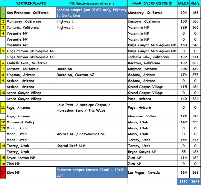 Vorige keer (2008) zijn we van LA naar de parken gereden (Lake Perris, Joshua Tree, Flagstaff, etc..), toen Las Vegas, Yosemite, de Highway 1 en weer LA. Achteraf gezien zijn we toen te snel gegaan. Bijna overal maar 1 overnachting en dan weer door. We willen nu minder plekken bezoeken, waar we dan wel 2 of 3 nachten blijven. Aan het begin en eind hebben we 3 dagen San francisco en Las Vegas (zonder camper), en daar tussen willen we met de camper proberen in ieder geval Yosemite Valley, de Highway 1, Moab, Monument Valley, Page en de Grand Canyon te bezoeken.