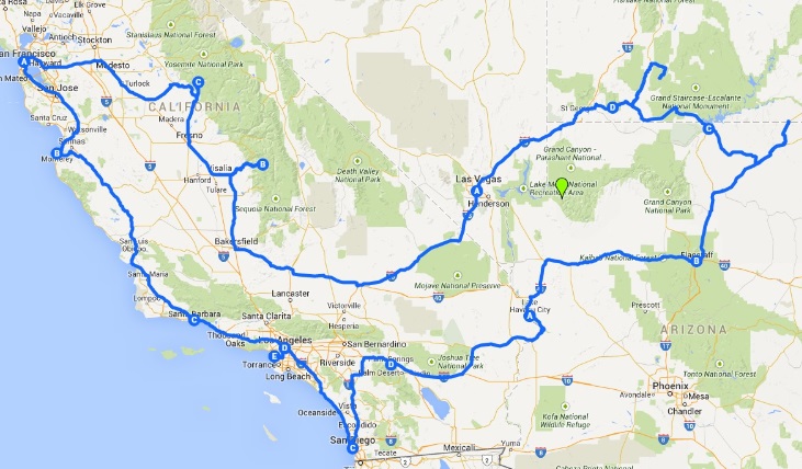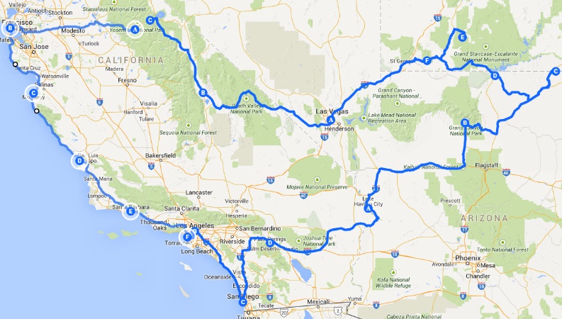 Ingrid heeft een mooie route. Wel zou ik 1 dag vd kustroute afhalen. Overnacht in Monterey en de dag erna in Pismo Beach of omgeving en rij dan de dag erna via Santa Barbara door naar LA. Zet dan die ene dag bij de Grand Canyon, Page of Zion, afhankelijk van hoe je die dagen in wilt delen.