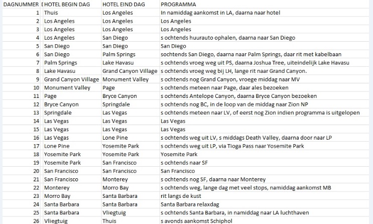 Heb een dagindeling gemaakt, op basis daarvan gaan we straks hotels boeken etc.