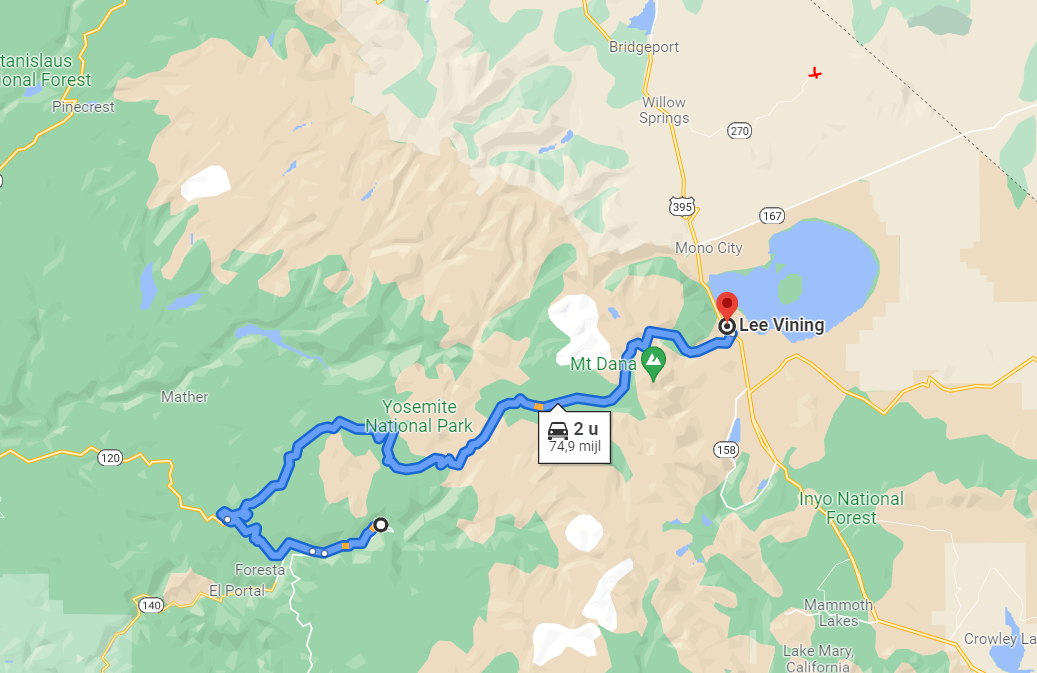 Dankje Marianne, dit is zeker een betere optie! Ik had de route bij Tioga Tours ingegeven en kreeg daar uit de tool dat de afstand tussen Yosemite en Mono Lakes ruim 500 mijl zou zijn. Ik denk dat het gekoppeld zit aan een live tool die nu ziet dat de Tioga Pass is gesloten en vandaag een omleiding laat zien.