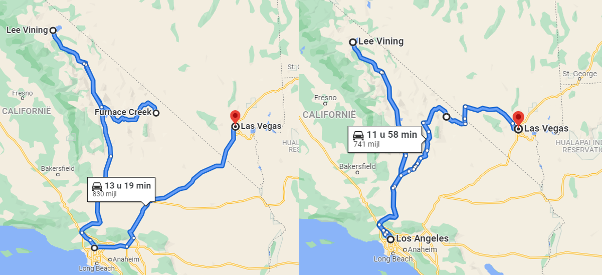 Je maakt nu wel een grote lus om naar LA te gaan, en je rijdt dan niet helemaal door DV heen. Je zou ook na Lee VIning naar Lone Pine kunnen gaan, dan naar LA (of rechtstreeks naar LA), en daarna via Death Valley naar Las Vegas.
