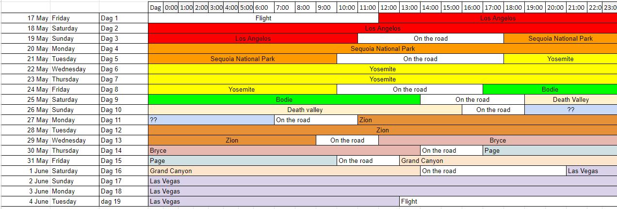 Oke nog een klein beetje geschoven. Een dag LA eraf gehaald om bij Zion/Bryce erbij te doen. Ook potentiele datums toegevoegd. Na wat reseach moet dit qua sneeuw en temperatuur overal goed uitkomen. Death valley schijnt nog wel oke te zijn eind mei met 30 graden gemiddeld. Iemand nog tips? Of onlogische dingen in deze planning?