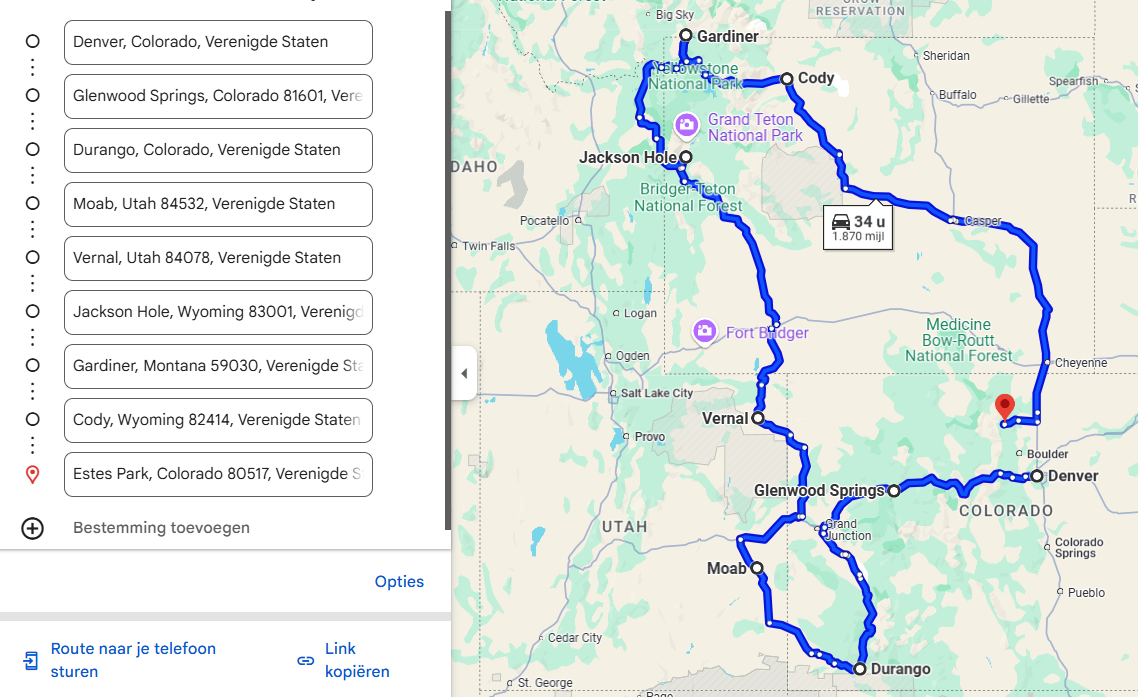 Nee, dat kan, maar dat hoeft niet. Je kunt ook direct vanuit Denver naar Cody rijden. Je bent dan eerder in Yellowstone, dus kijk eens naar de mogelijkheden qua accommodatie dan. Maar alles omdraaien kan ook.charlotte1981 schreef: ↑07 mei 2025, 17:24@ Marianne: Wat bedoel je met :Het is ook niet gek om RMNP op het laatst te doen; dan vermindert de kans op hoogteziekte. En wellicht heb je dan meer mogelijkheden in Yellowstone.