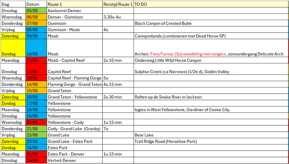 Ik heb nog wat gepuzzeld aan de Colorado week, maar dit lijkt me een mooie planning.