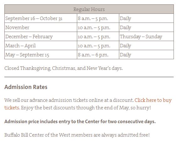 Bron: http://centerofthewest.org/visit/hours-and-rates/
