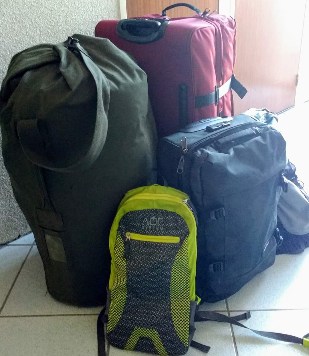 Die plunjebaal gaat als ruimbagage mee. Op deze foto zie je wat wij vorig jaar meenamen. De kampeerspullen in de plunjebaal en de rest in de andere koffer en de handbagage.