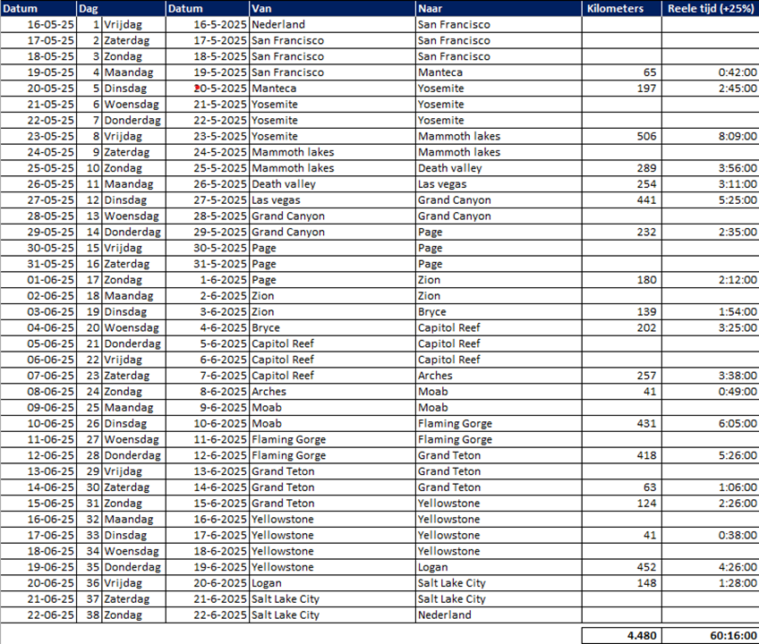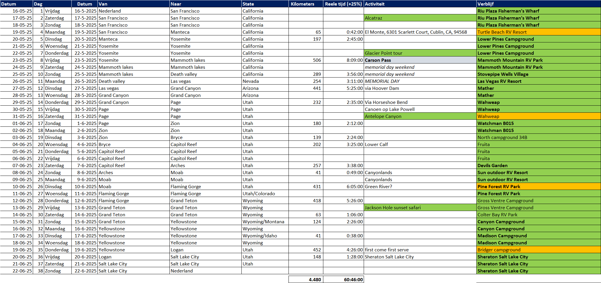 Hieronder het schema. Al het groene ligt vast. Er zit wel een paar wat langere reisdagen tussen, maar niets wat te lang is. We hopen natuurlijk dat de Tioga (of anders Sonora) open is, maar in dit schema is nog rekening gehouden met de Carson Pass. Enige campground die ik wellicht nog ga omboeken is die in Mammoth Mountain naar Mono Lake omdat het in die tijd wellicht nog behoorlijk koud is in de bergen. Nog 89 nachten!