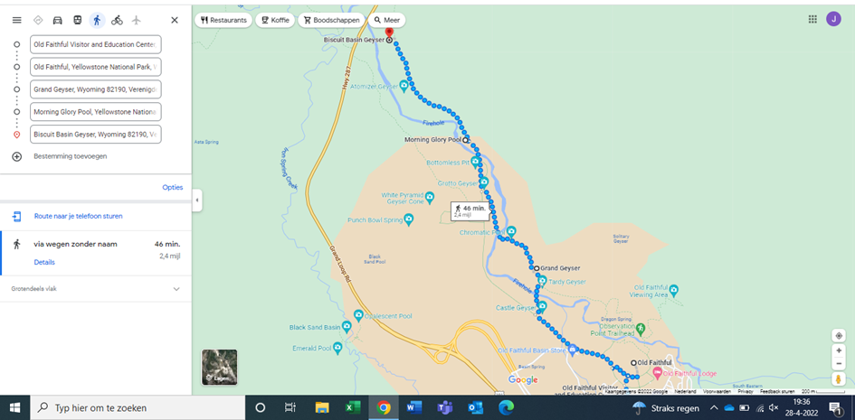 Ik bedoel niet zozeer alleen echt hikes, maar ook gewoon wandelpaden bij de bezienswaardigheden, zodat ik een beeld krijg van hoe lang je ergens bezig bent. Als ik op maps kijk bij bijvoorbeeld Old Faithful dan zijn er vanuit daar al heel wat geysers te zien en kun je daar dus volgens mij zo een paar uur wandelen/kijken. Dat soort dingen vind ik handig om te weten om te bepalen waar we 's morgens vroeg het beste vroeg kunnen zijn om zeker te zijn van een parkeerplaats en zeker te zijn van een paar uur 'vermaak'.