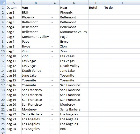 Als je je route in excel hebt, waarom dan niet op deze manier? Dan heb je het duidelijk per dag genoteerd. De laatstse kolom kun je zo uitgebreid maken als je wilt. Als je het dan op het forum plaatst hoef je alleen maar de eerste kolommen te kopiëren.