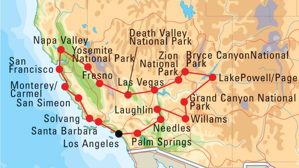 Je mist in deze route de kustweg, San francisco en Yosemite, maar doordat de Tioga Pass dicht is wordt het erg moeilijk en te gehaast om dit allemaal nog in te passen. De bovenstaande route is nog best rustig, zodat je Zion en Sequoia rustig kunt bekijken en niets te haastig hoeft te doen.