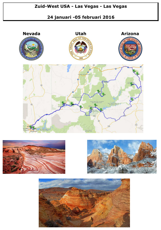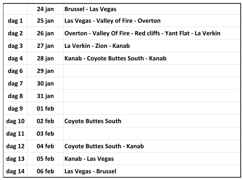Voorlopige "planning" die we voor de rest gaan laten afhangen van de weersomstandigheden. We hebben voor 3 dagen permits voor de Coyote Buttes South, maar we gaan er waarschijnlijk maar 1 dag heen, ook al bepaald door de weersomstandigheden en de toestand van de House Rock Valley Road.