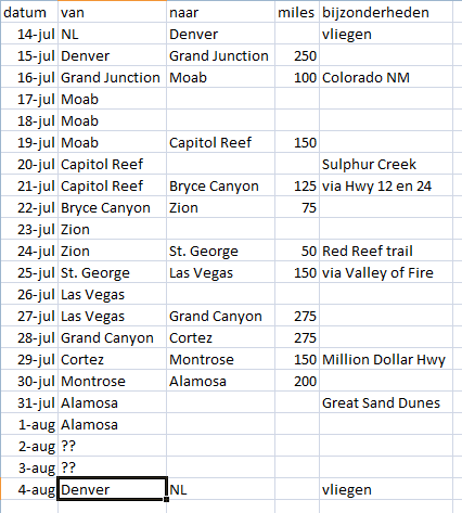 Onze zoon wil graag nog een keer naar de Great sand dunes vandaar dat ik (bij de flash sale) voor vliegen op Denver koos. Echter wil hij eigenlijk ook graag naar Las Vegas omdat hij in mei 21 wordt. Ik denk dat dit de laatste keer is dat hij meegaat(met zijn vriendin) daarom mogen zij kiezen wat ze graag willen. Ze willen ook nog graag naar Capitol reef voor de Sulphur creek wandeling en eten bij Slickers, vorige keer waren er floods.