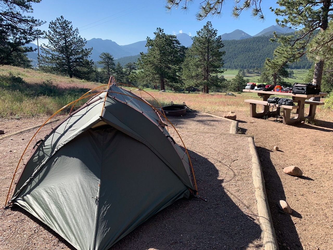 Voor de sfeer even een foto van ons toch wel erg fijne plekje op een camping in RMNP, tijdens onze meest recente Amerika-reis. Op onze picknicktafel zie je een heleboel bagage liggen, want deze foto is gemaakt op de ochtend dat we naar huis vlogen. Tijd om de tas in te pakken dus. :wink: