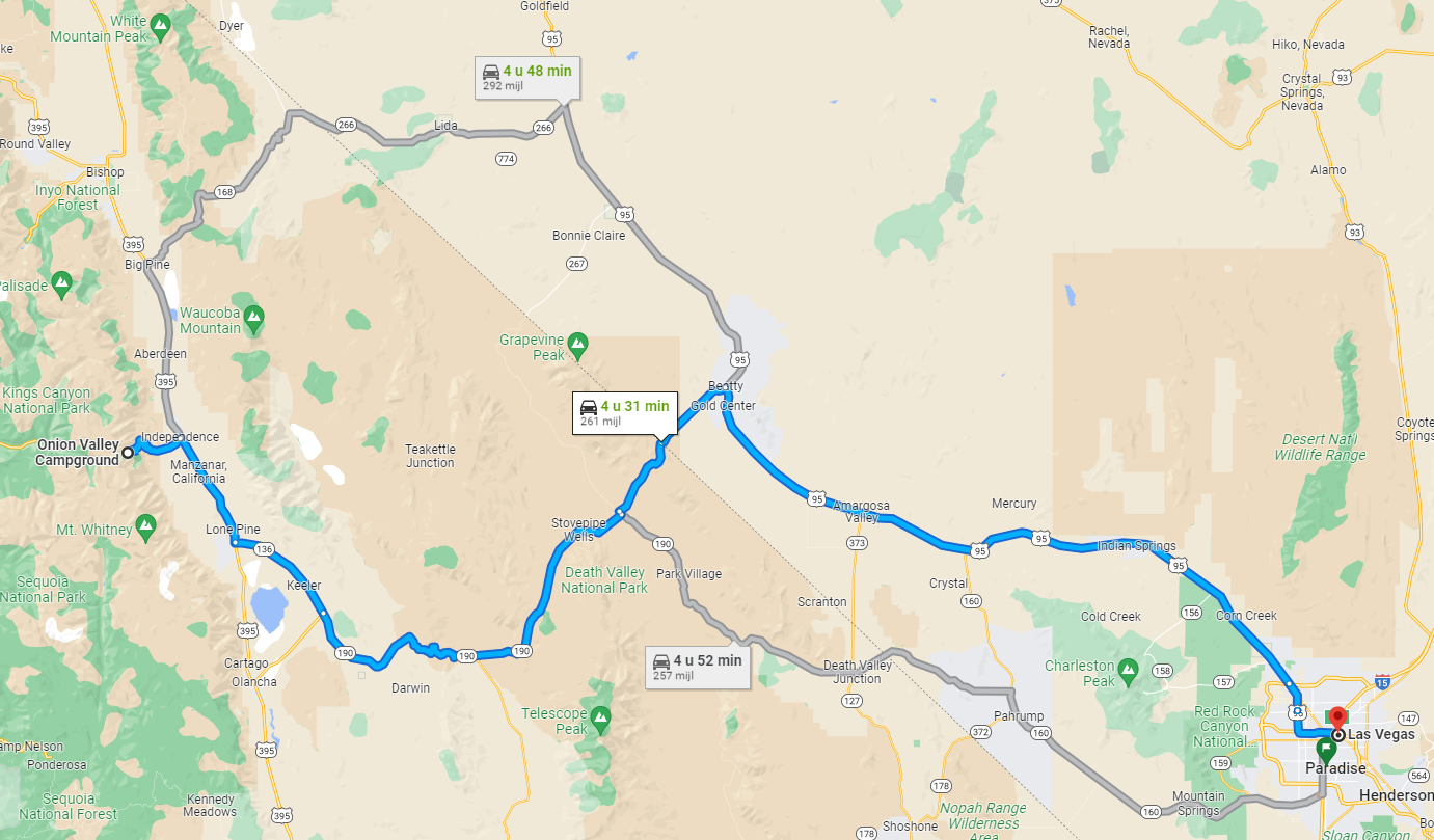 Er blijken drie routes richting Las Vegas te zijn, zie kaartje, die niet zo heel veel in tijd verschillen. We neigen naar de route door Death Valley, omdat we nog nooit vanaf west naar oost zijn gereden. Maar misschien zijn de andere routes ook de moeite waard? Wie heeft ervaring?