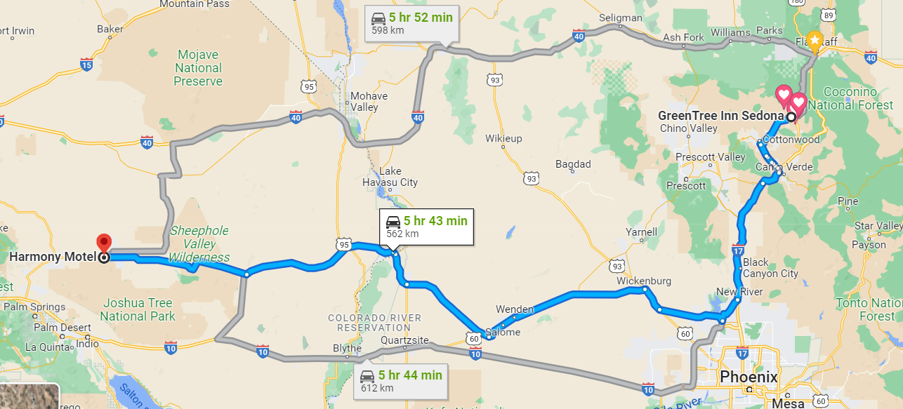 Maar zoals aangegeven in het onderwerp zit ik nu met een vraag. Dag 17 (Sedona naar Joshua Tree) wordt een behoorlijke reisdag. Nu geeft google maps meerdere mogelijkheden qua route:
