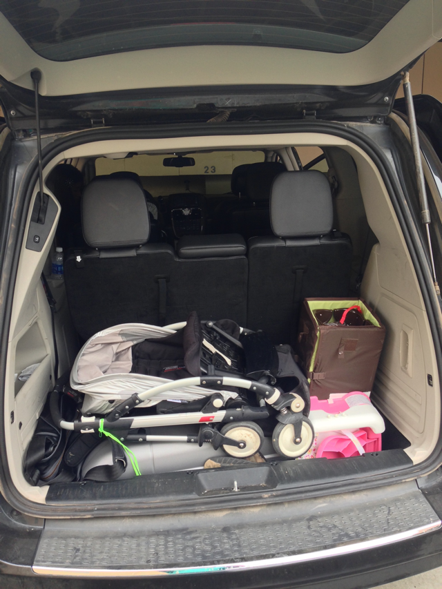 En hier is de koffer met alle stoelen omhoog, er ligt onderin in ieder geval een grote harde grijze koffer en rechts staat een reisledikantje op zijn kant, geeft een beetje aan hoe diep het gat is waar je de derde zitrij in kan klappen. Dit was voor een tripje met zijn drietjes denk ik, aan de hoeveelheid bagage te zien. Wat ik me herinner was het met 5 en de baby wel helemaal vol aan bagage.
