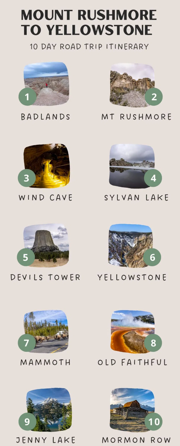 Je wilt een rondje doen? Dat betekent dus dat je twee keer het relatief saaie stuk tussen Yellowstone en South Dakota rijdt. Ik zou daar niet voor kiezen. Het betekent ook dat je weinig tijd overhoudt voor Yellowstone en South Dakota zelf. Reken voor Yellowstone en Grand Teton samen minimaal 5 nachten en voor South Dakota 3 of 4. De route via de Beartooth Hwy is een aanrader (maar misschien nog niet open), maar dat kost je ook de nodig tijd. En dan nog vanuit Grand Teton of Yellowstone naar SLC; dat lukt dan niet in 10 dagen. Heb je het al eens per dag uit uitgewerkt? Alleen op die manier zie je of het echt mogelijk is en kun je verder naar de invulling kijken.