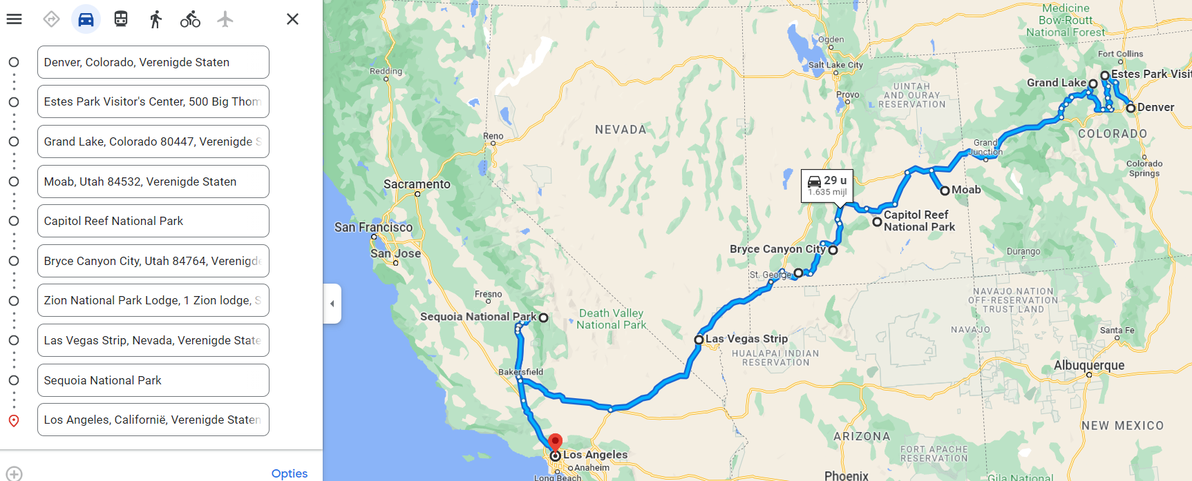 15 nachten voor deze afstand en alle bezienswaardigheden lijkt mij veel te weinig. Waarom helemaal naar LA ? Ik zou in deze reistijd Denver-Las Vegas aanraden met RMNP inderdaad, dan paar nachten Moab/Arches/Canyonlands, dan Page, evt Grand Canyon, dan Zion & Bryce en eindigen in Las Vegas. Anders zie je vooral asfalt en rij je alle mooie parken voorbij…..