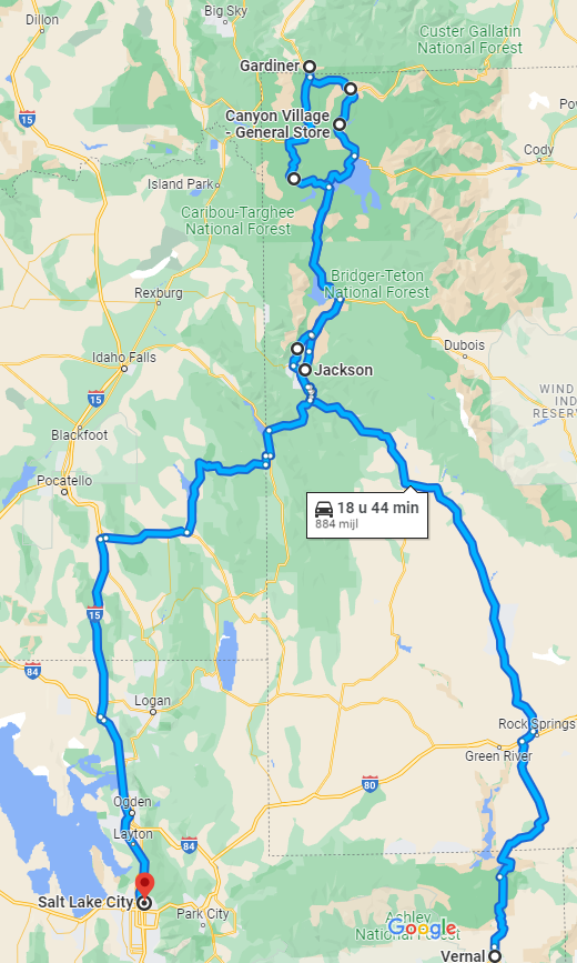 In plaats van zo: Scheelt misschien 2 uur rijden, hoewel je in Grand Teton weer wat bespaart, maar het is een mooiere route.